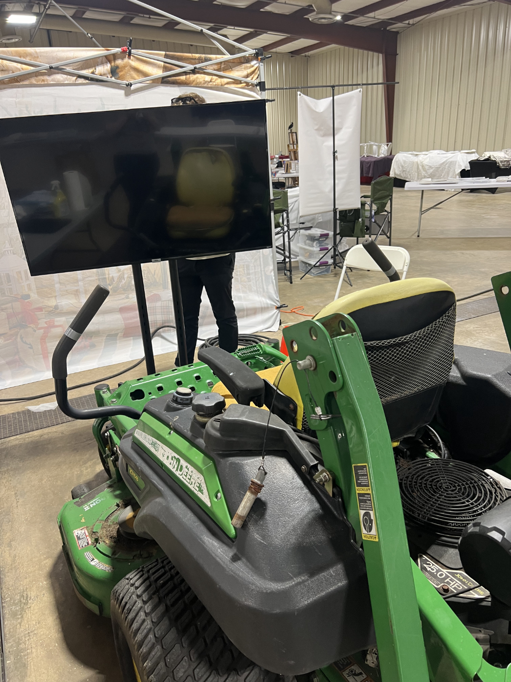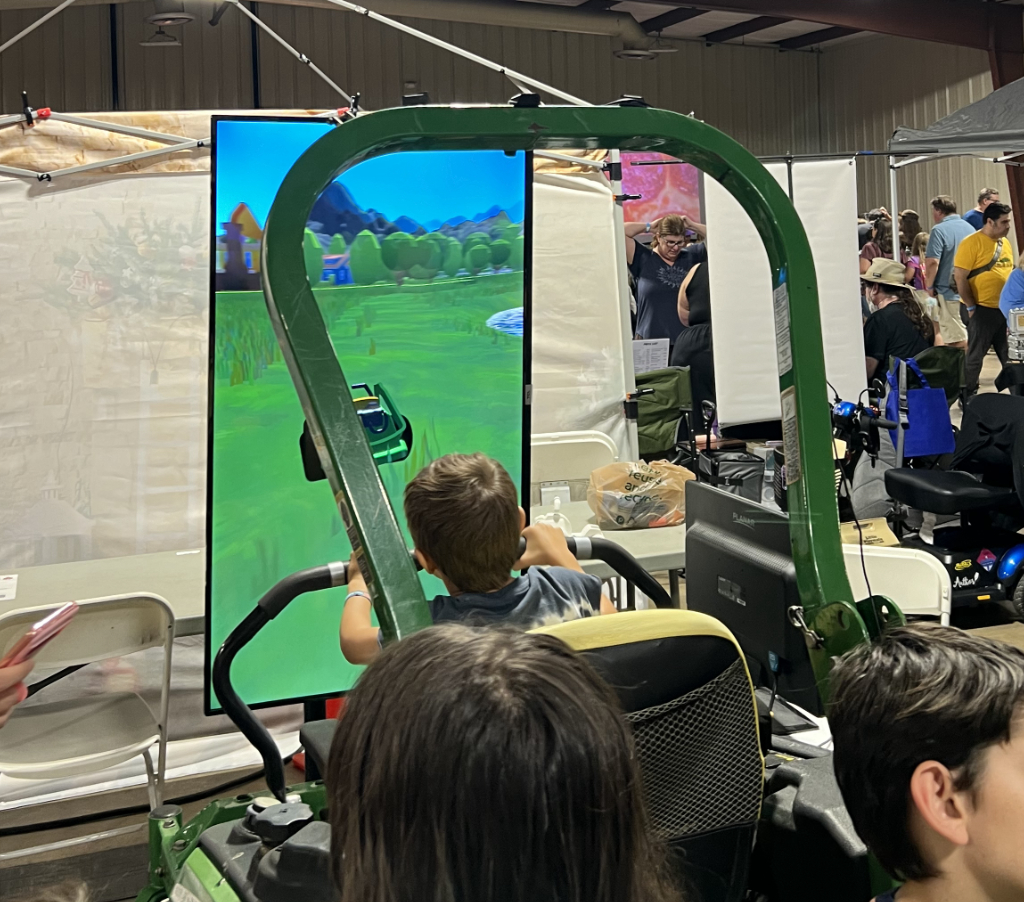 I made this project for Maker faire Orlando – a family-friendly showcase of invention, creativity, and resourcefulness. It utilizes computer vision to integrate the controls of the zero-radius lawn mower into a unity game!